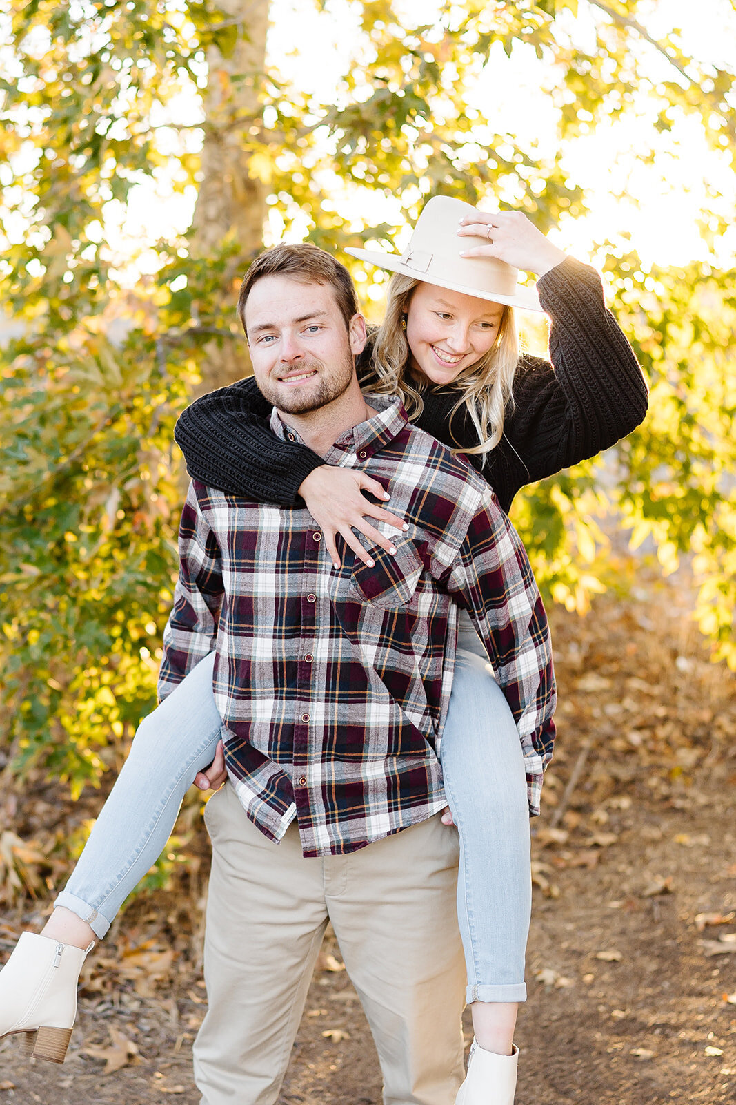 I had the delightful opportunity to photograph Amanda and Quinn's engagement session at Thomas F. Riley Wilderness Park. As they stepped into the park, Amanda and Quinn exuded a palpable excitement, dressed in perfectly coordinated outfits that featured charming plaid patterns. Adding an extra touch of sweetness to the scene was Amanda's adorable hat, which lent a whimsical flair to their attire. Navigating the natural trails of Thomas F. Riley Wilderness Park, I was in awe of the beauty that enveloped us. The park's tranquil ambiance and rustic charm provided an idyllic backdrop for capturing Amanda and Quinn's love story. As an engagement photographer in Orange County, I'm always on the lookout for enchanting locations like Thomas F. Riley Wilderness Park, which offers a serene setting that perfectly complements the intimacy of such sessions. With every click of my camera, I endeavored to capture the genuine affection and joy shared between Amanda and Quinn. It was honestly a lot of fun! Against the backdrop of towering trees and meandering paths, their love blossomed effortlessly, creating moments that would be cherished for a lifetime. Thomas F. Riley Wilderness Park proved to be the perfect canvas for their engagement session, allowing us to craft images that reflected the essence of their relationship. As the sun began to set, casting a warm glow over the park, Amanda and Quinn's love shone even brighter. Together, we captured the magic of their engagement amidst the beauty of nature, creating photographs that would serve as timeless reminders of their journey together. Thomas F. Riley Wilderness Park photos became a cherished memento of their love story, preserving the joy and excitement of this special chapter in their lives.